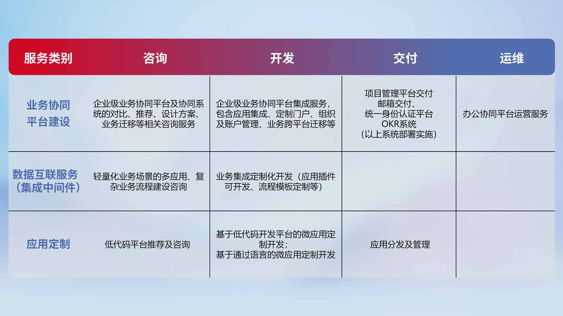 针对钉钉、、、企微、、IDaas等平台级产品提供产品的规划、、、、方案、、、交付、、、、定制化开发等服务,,,,实现如统一协同办公、、、智能客户服务、、混合会议管理、、、智能数据查询、、、、等业务场景,,,实现数字化转型。。。。